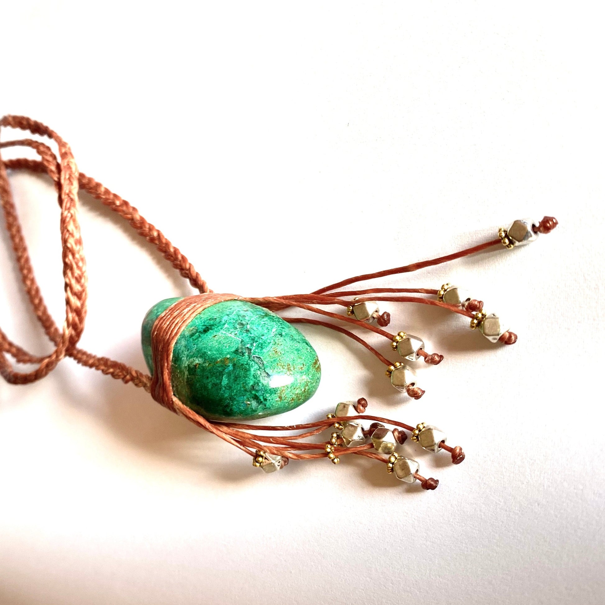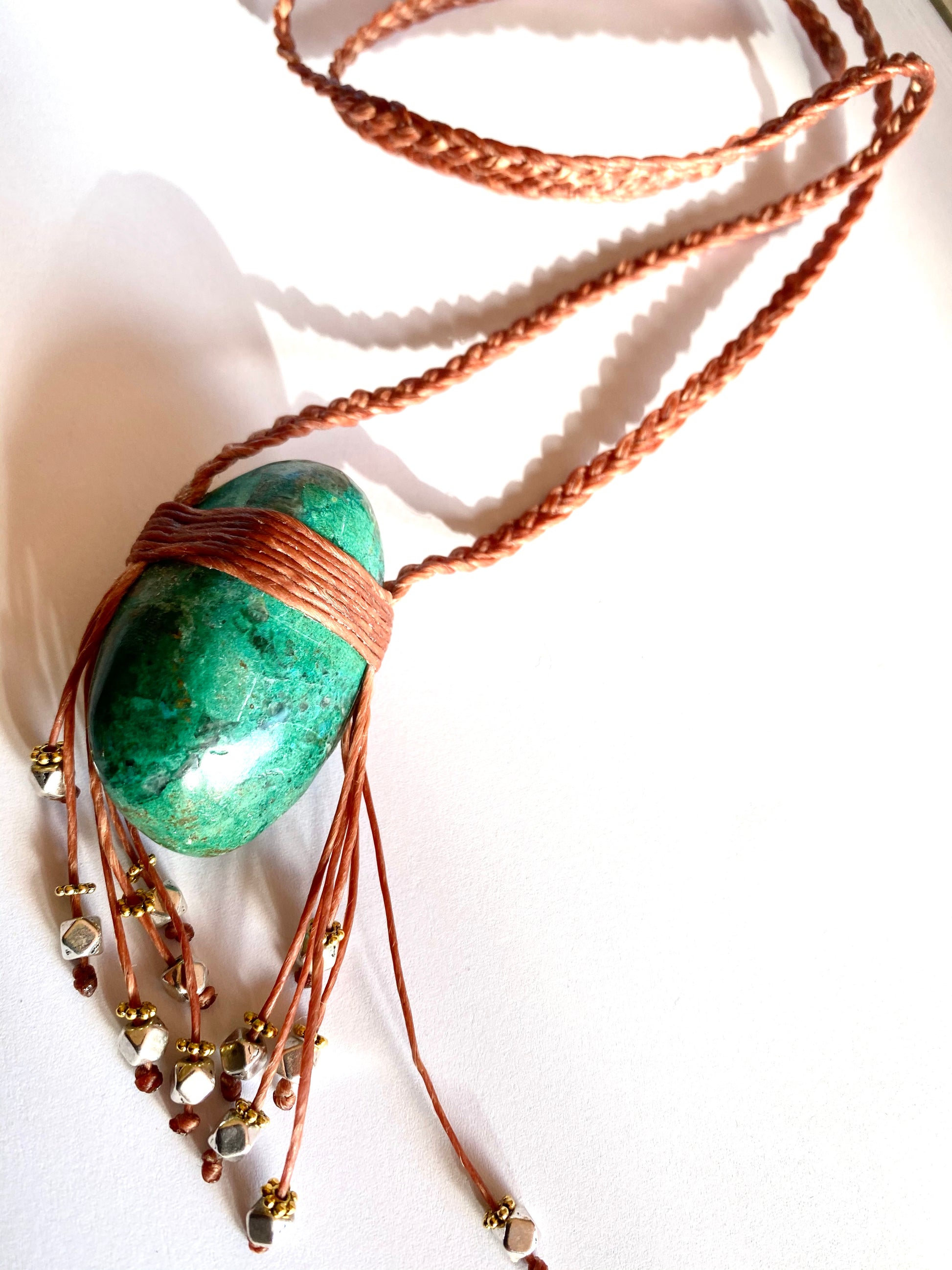 Polished Chrysocolla wrapped in terracotta coloured waxed cord, double plait with silver bead detail.