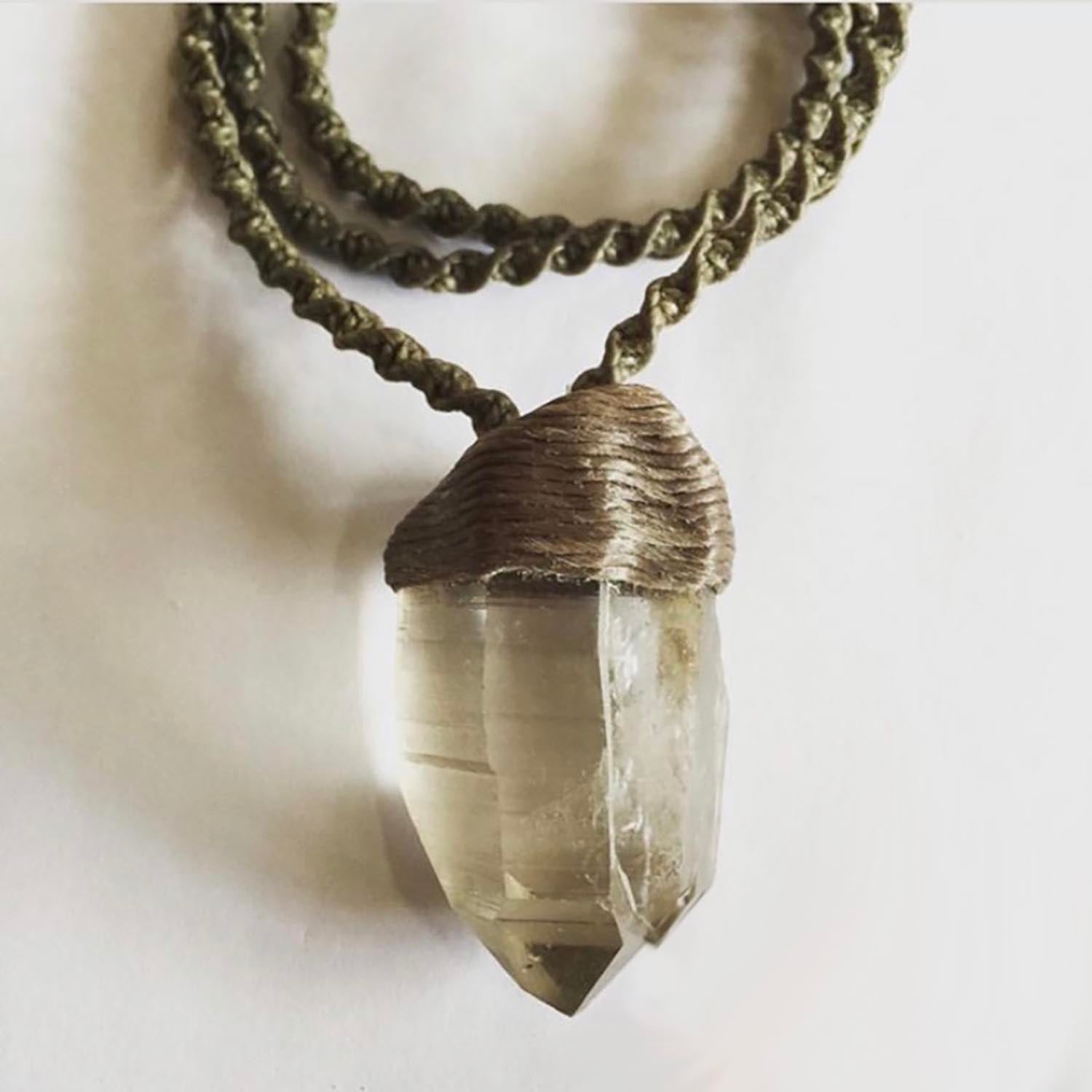 Lemurian Twin Quartz crystal point wrapped in smoke coloured waxed cord, macrame spiral weave. Hand made in Byron Bay, one of a kind.