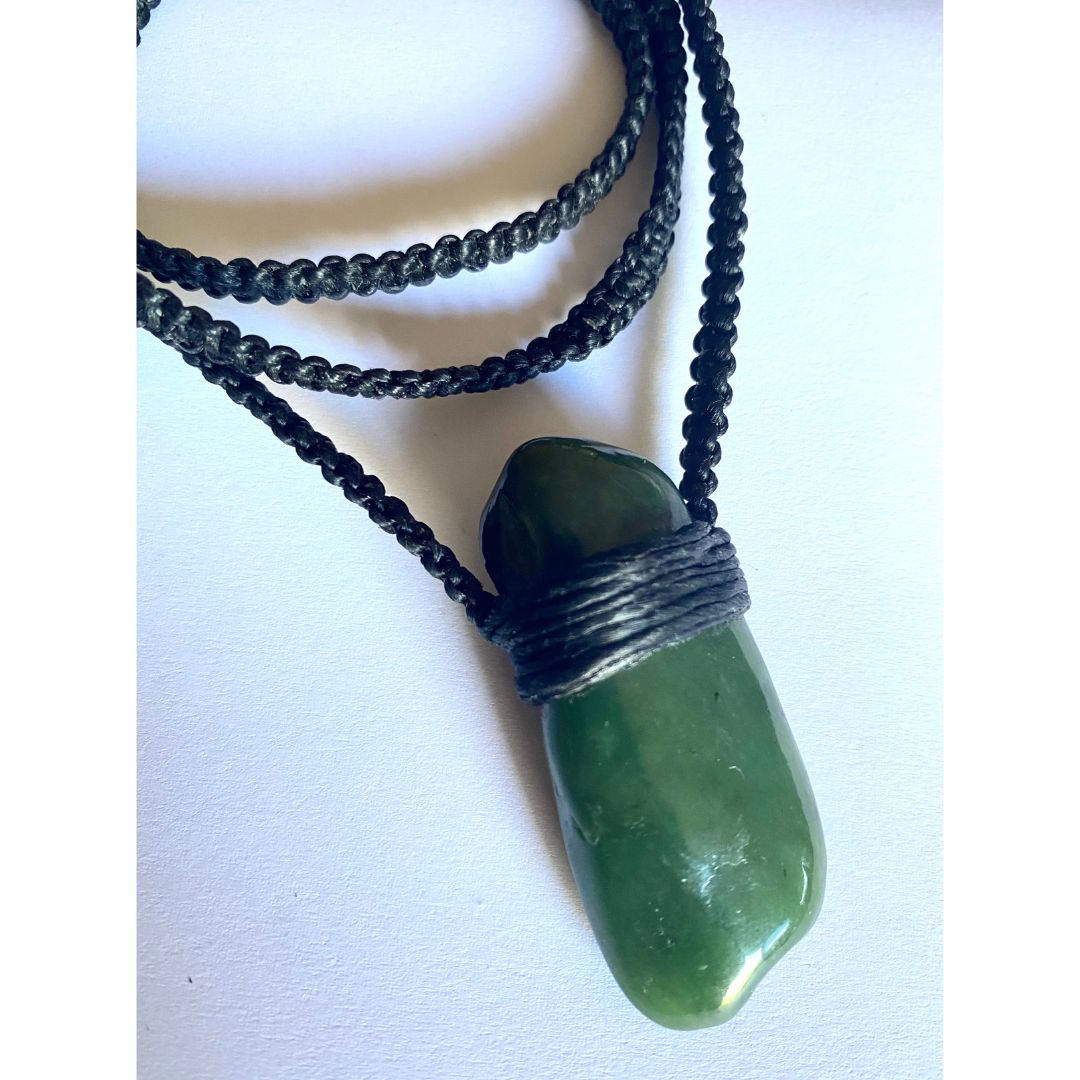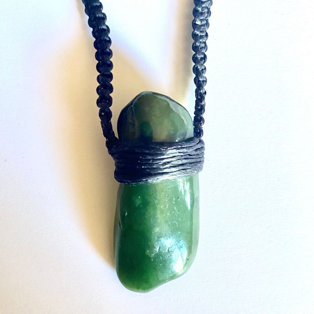 Polished Nephrite Jade wrapped in black waxed cord, macrame flat weave.