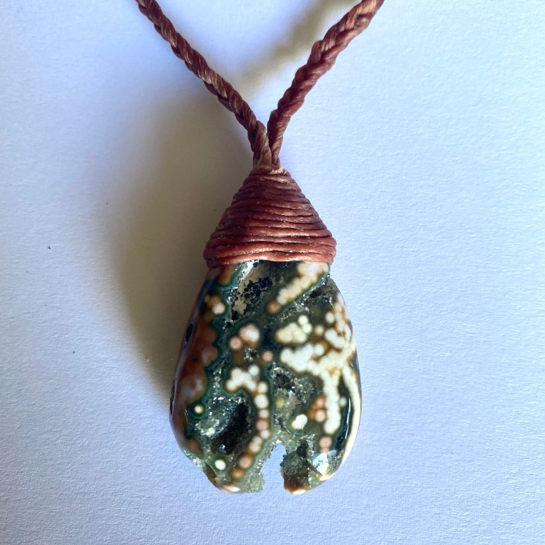 Semi-polished Ocean Jasper (with micro-crystalline druzy crystals) wrapped in terracotta coloured waxed cord, double plait.
