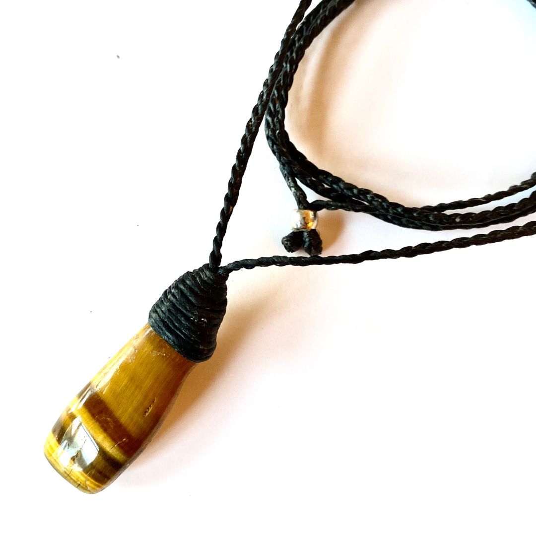 Polished Tiger's eye wrapped in black waxed cord, single plait weave.